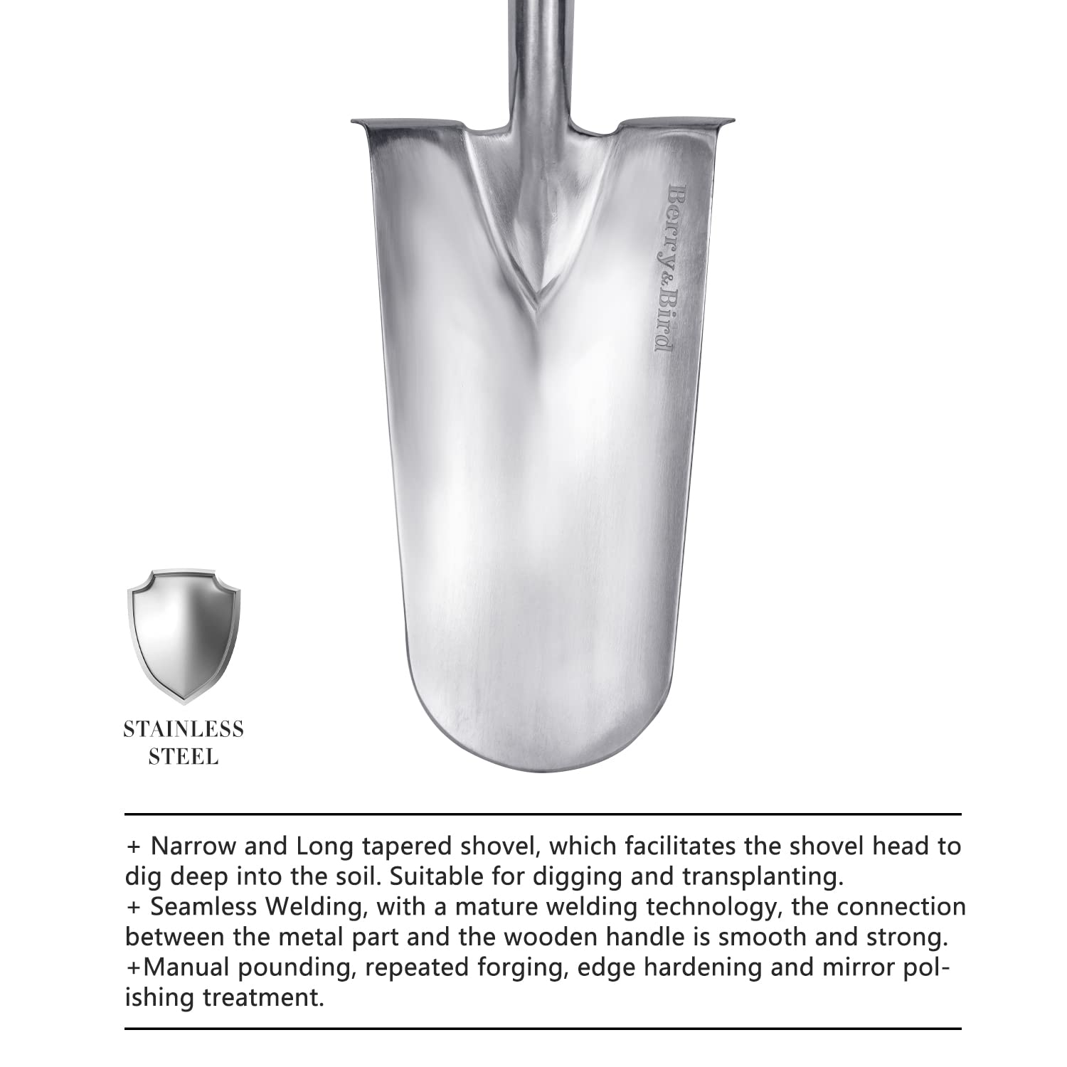 Ergonomic Wood Handle: The handle of this planting spade is made of ash hardwood harvested from FSC-certified forests and has an ergonomically streamlined design, making it very suitable for everyone's hands. This specially designed handle can effectively reduce the fatigue of our hands and prevent injuries. The non-slip D-shaped handle keeps your wrist in a neutral position to reduce stress, providing comfort and good grip, which can firmly cut through hard and difficult surfaces.